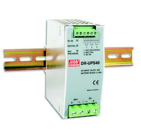 Контроллер аккумулятора системы бесперебойного питания на DIN рейку. DR-UPS40 проверяет состояние аккумуляторной батареи, защищает батарею от обратного напряжения, автоматически подключает батарею при пропадании выходного напряжения сетевого источника питания. Для построения бесперебойного источника питания к модулю DR-UPS40 необходимо подключить аккумуляторную батарею на 24 В емкостью 4, 7 или 12 А/ч и сетевой источник питания с выходным напряжением 24 В (например, модули серий MDR, DR, DRP, DRT).